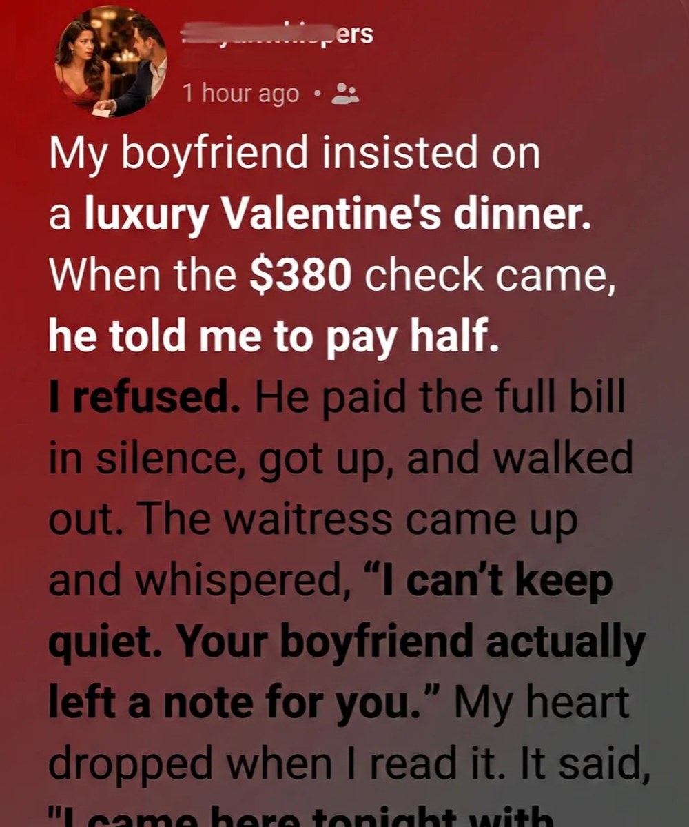 That evening, my boyfriend surprised me with a reservation at one of the most elegant restaurants in the city. It wasn’t our usual style. Soft violin music drifted through the air. Candles flickered against crisp white tablecloths. Crystal glasses caught the light like tiny stars.
